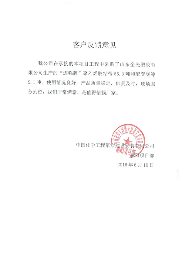 我公司在承接的本項目工程中采購了山東全民塑膠公司生產(chǎn)的“邁強牌”聚乙烯膠粘帶55.3噸和配套底漆9.1噸。使用情況良好,產(chǎn)品質(zhì)量穩(wěn)定,供貨及時,現(xiàn)場服務(wù)到位,我們非常滿意,是值得信賴廠家。